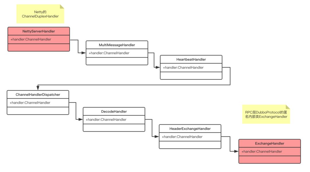 每个ChannelHandler的实现类都是继承ChannelHandlerDelegate,即实现委托模式。所以每ChannelHandler中都持有前一个ChannelHandler。每New一个ChannelHandler都要传入一个ChannelHandler,所以就构成了一条链。