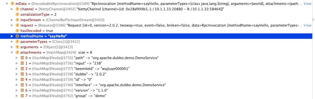 请求元数据描述类型为RpcInvocation(org.apache.dubbo.rpc.Invocation)。Invocation字段包括:序列化标志(决定使用哪个序列化协议,比如2就是hession2)、远程调用的方法名(sayHello)、方法参数类型(String),调用传递的参数(hello)。请求附带的参数:请求路径(dubbo协议为接口名),dubbo版本、接口名、接口版本、分组等。