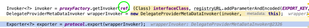 private <T> ExporterChangeableWrapper<T> doLocalExport(final Invoker<T> originInvoker, URL providerUrl) {String key = getCacheKey(originInvoker);return (ExporterChangeableWrapper<T>) bounds.computeIfAbsent(key, s -> {// 包装InvokerInvoker<?> invokerDelegate = new InvokerDelegate<>(originInvoker, providerUrl);// 根据SPI自适应扩展点机器,导出服务return new ExporterChangeableWrapper<>((Exporter<T>) protocol.export(invokerDelegate), originInvoker);});}