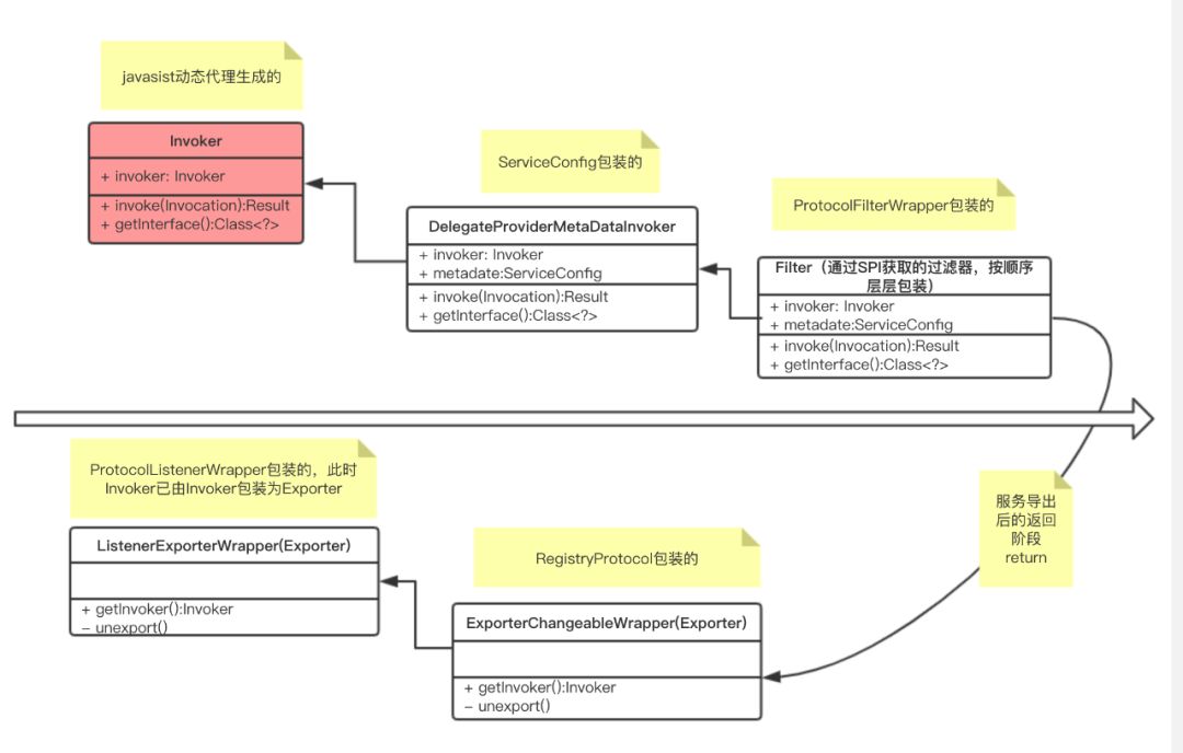 我们接着看invoker.invoke(inv)的整个调用链。回过头去跟踪下整个服务导出的链路,看看最初的Invoker是什么类型,以及都经过了多少层包装。