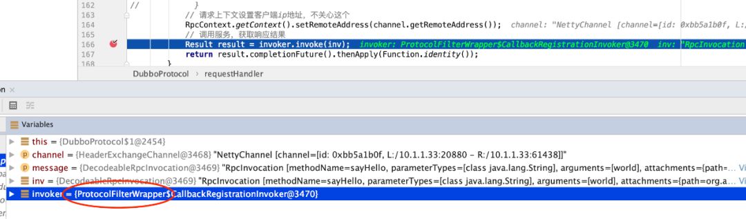 因此,DubboProtocol的requestHandler的reply方法中拿到的invoker是经过过滤器层ProtocolFilterWrapper包装的。