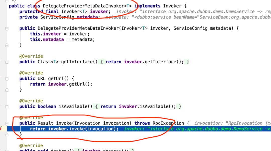 分析到这,你应该知道过滤器是怎么起作用了吧。请求先是经过过滤器处理,如果过滤器都不过滤请求,会先到配置层包装的DelegateProviderMetaDataInvoker。跳过过滤器,直接在DelegateProviderMetaDataInvoker的invoker方法中下断点。
