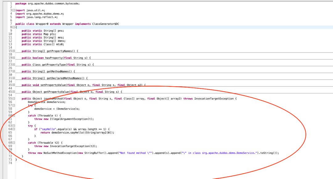 @Overridepublic <T> Invoker<T> getInvoker(T proxy, Class<T> type, URL url) {// 动态代理包装DemoServiceImplfinal Wrapper wrapper = Wrapper.getWrapper(proxy.getClass().getName().indexOf('$') < 0 ? proxy.getClass() : type);// 再给生成的动态代理类包装一层代理return new AbstractProxyInvoker<T>(proxy, type, url) {@Overrideprotected Object doInvoke(T proxy, String methodName,Class<?>[] parameterTypes,Object[] arguments) throws Throwable {return wrapper.invokeMethod(proxy, methodName, parameterTypes, arguments);}};}