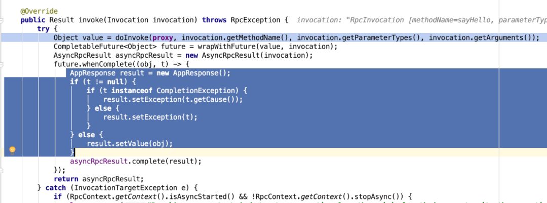 @Overridepublic CompletableFuture<Object> reply(ExchangeChannel channel, Object message) throws RemotingException {// 请求消息Invocation inv = (Invocation) message;// 获取InvokerInvoker<?> invoker = getInvoker(channel, inv);// 请求上下文设置客户端ip地址,不关心这个RpcContext.getContext().setRemoteAddress(channel.getRemoteAddress());// 调用服务,获取响应结果Result result = invoker.invoke(inv);return result.completionFuture().thenApply(Function.identity());}