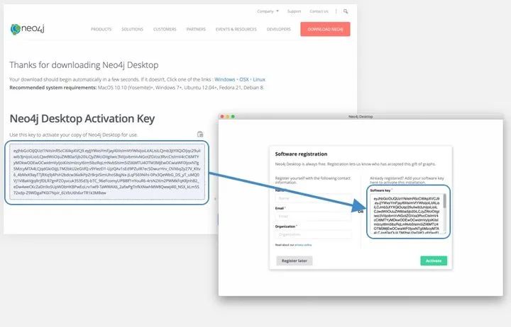 在点击下载安装包的时候,Neo4j会自动生成一个Activation Key。在第一次运行Neo4j Desktop的时候,把他录入进去,激活即可,详见下图。