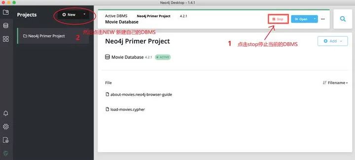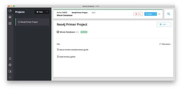我们第一次打开 Neo4j Desktop 时,已经有了一个 Neo4j Primer 项目,其中电影数据库已经启动。