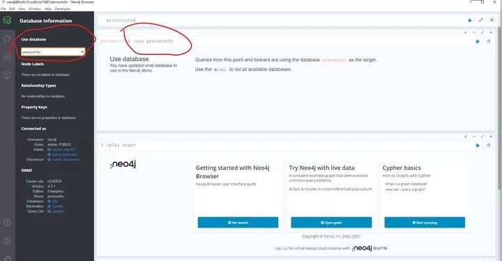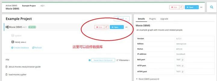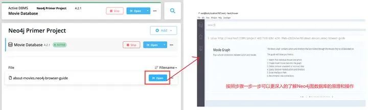 如果想开始学习使用 Neo4j 和 Cypher,我们就可以使用这个已经启动的 DBMS。这个示例项目有指引,可以一步一步的学习(这个示例项目不在本文探讨范围,后续专门写文章一步一步分析)。