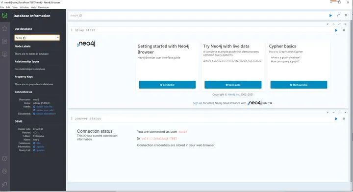 DBMS 启动后,您可以通过运行在您系统上的客户端(例如 Neo4j Browser、Neo4j Bloom 等)访问它。在 Neo4j Desktop 中,DBMS 是一个企业服务器,但它只能在本地访问。