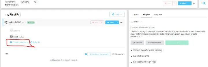 我们创建完自己的DBMS以后,里面已经默认建立了两个数据库。分别是:neo4j和system,见下图:
