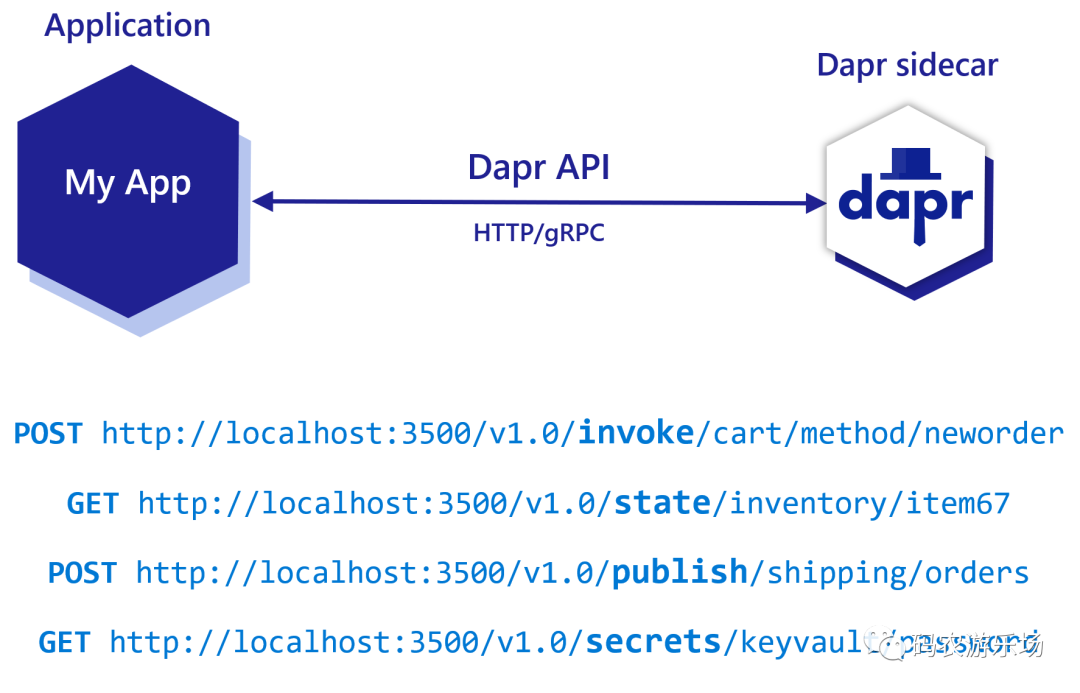 Dapr以 sidecar 架构的方式公开其API,可以是容器,也可以是进程,不需要应用代码包含任何 Dapr 运行时代码。这使得 Dapr 与其他运行时的集成变得容易,同时也提供了应用逻辑的分离,改善可支持性。