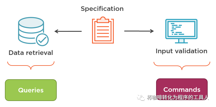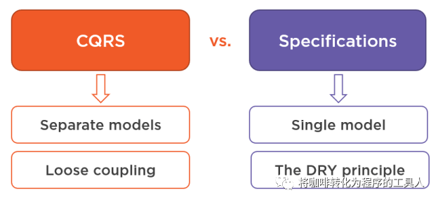 CQRS和规约模式在这里有一个明显的矛盾。其中,规约模式主张为这两个关注点使用一个域模型。而CQRS主张将领域模型一分为二,并分别处理这些问题。