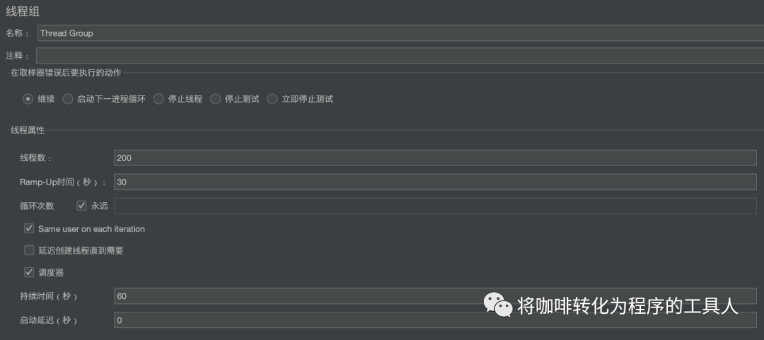 我们在jmeter里创建一个线程组,设置最终的目标是200个线程,ramp-up时间设置为30s,也就是说在30s,会创建出200个线程并发出请求,并且设置了压力测试持续时间为60s。