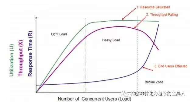通常来说,随着用户数的增加,系统的响应时间也会慢慢增加。TPS前期也是一直在增加,但是会随着用户数到达一定的数量而幅度减缓,最终变平。所以,通过TPS的曲线,我们可以明确知道系统有没有瓶颈,以及TPS、响应时间和压力之间的关系是什么。