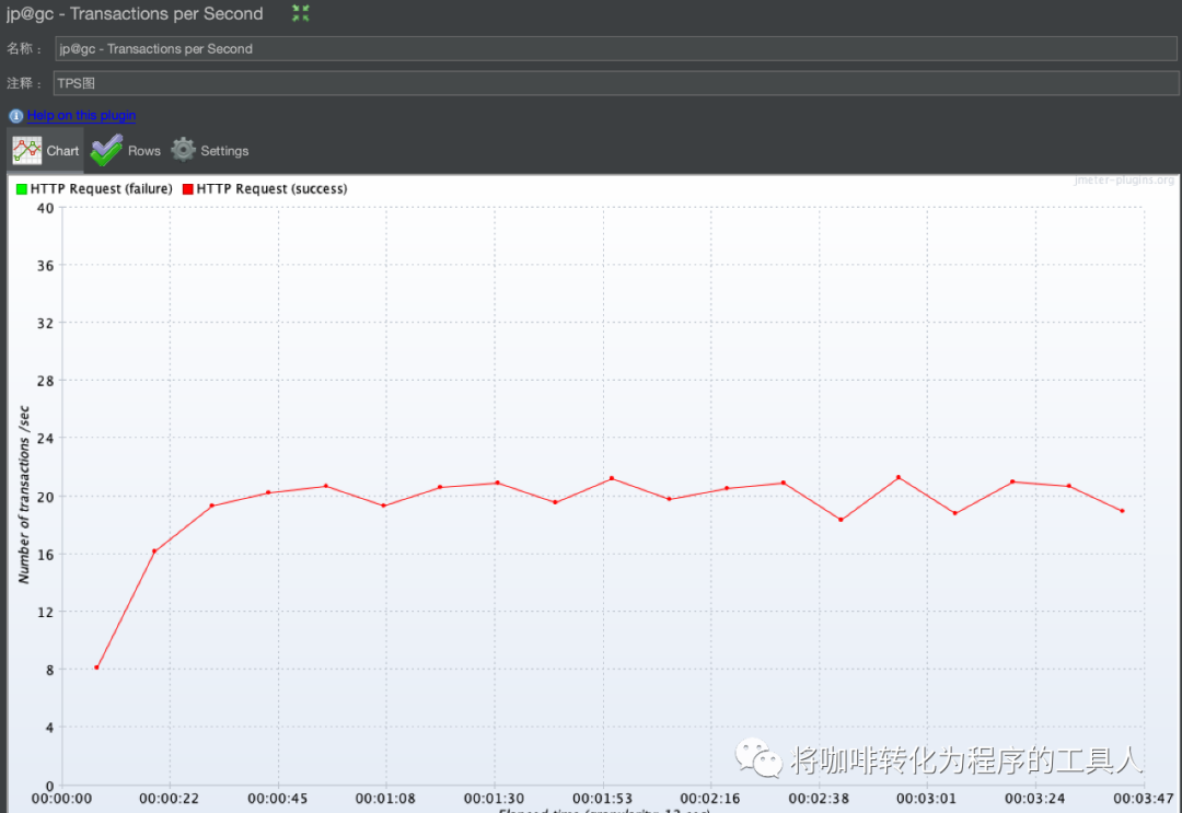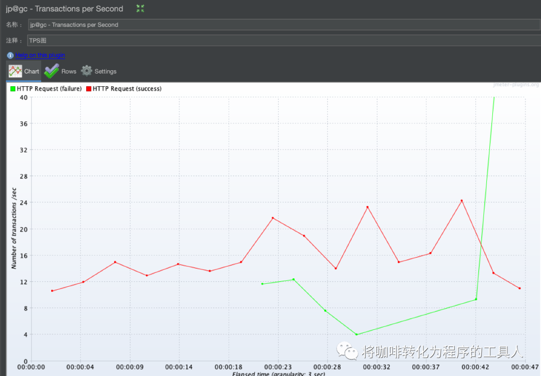 从下面实际运行后的TPS图中可以看出,TPS在23秒之前一直处于上升阶段,从9TPS升到了20TPS,23s左右的时候TPS已经接近最大值,且开始出现绿色代表的失败的请求。