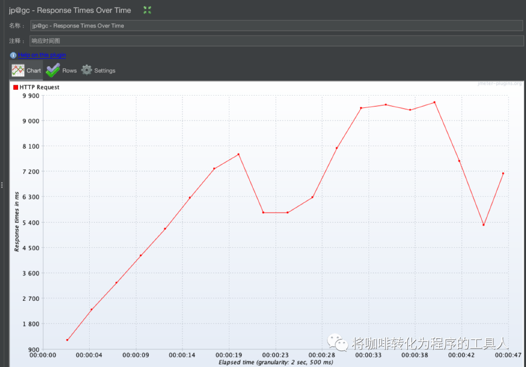 再来看下响应时间图,随着线程数的缓慢增多,响应时间也越来越久,但是可以发现在这种递增压力策略之下的响应时间明显比方案一中的响应时间要短,在45s达到最大TPS的时候,响应时间只需要2s左右。