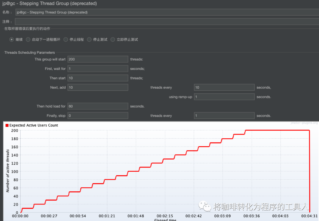 于是,我们换一种线程递增的压力策略,如下图配置,同样是最终达到200个线程,最开始的时候只启动10个线程,接下来每10秒添加10个线程,10个线程在1s的时间内创建出并发出请求,启动线程达到最大200个之后,继续持续压力运行60s。