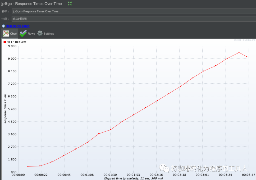 对照着看一下响应时间的图,可以看到响应时间随着线程数越来越多,呈线性增长,23s之后出现了一波响应时间的激增,开始出现大量的超时请求,和TPS图中绿色的曲线的时间基本吻合,在23s达到最大TPS时,响应时间大概需要5.6s。