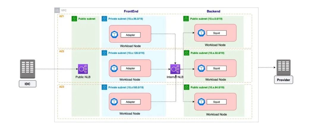 公有云厂商普遍采用按流量收费的价格策略,在设计网络出入站网络访问的技术方案过程中,默认情况下会使用AWS NAT网关,这样网络流量费用相对较高。考虑到酒店直连请求有个特性,通常情况下请求报文不到1K,而响应报文平均有10k到100K,利用这个特点,我们在AWS上采用了基于EKS自建Squid代理方案(见图4),这样只有出站的请求报文会产生流量费用,而大量入站的响应报文不收费,从而大大降低AWS上产生的网络流量费用。