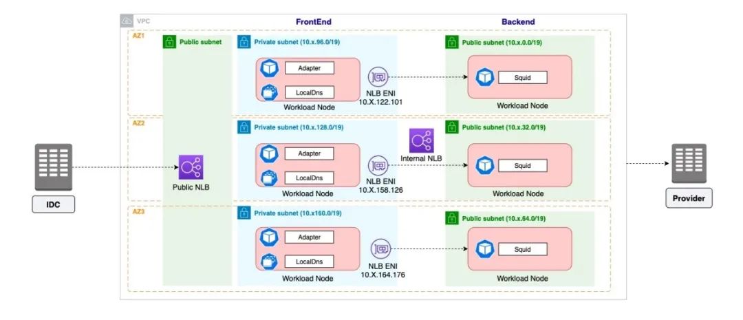 经过不同的方案调研最终我们使用 AWS NLB 来暴露服务,通过 NLB 的 disable cross-az 功能,对同可用区的上下游服务进行流量可用区管控。同时使用之前提到的 local dns 组件,将上游服务访问NLB不同可用区的域名解析进行固化,保证了上下游的服务流量只能在可用区内部进行互通。改造后如下图: