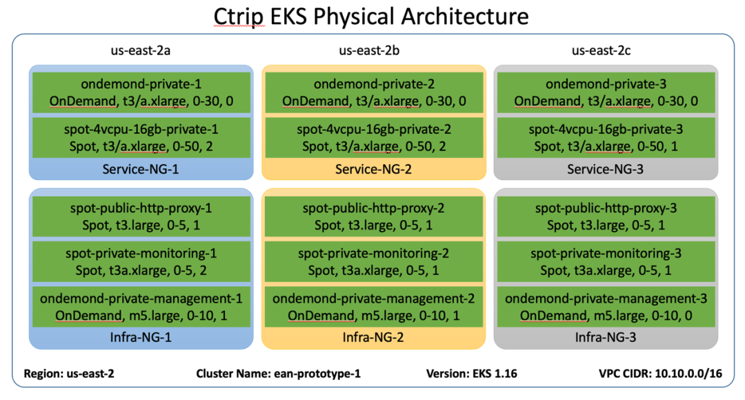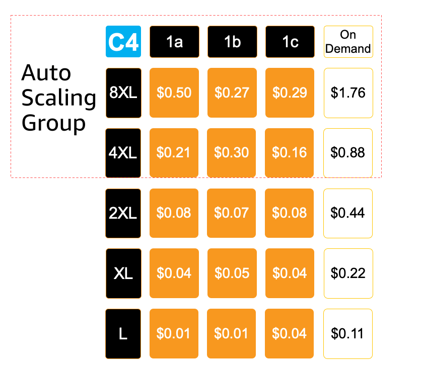 为了能最大限度减少竞价实例的中断影响,包括实例在多可用区的再平衡影响,我们在通过ASG(AWS auto scaling Group 弹性扩展组)选择不同实例类型的情况下还将不同的实例资源池独立使用ASG进行管理,这样保证了资源的最大利用效率。