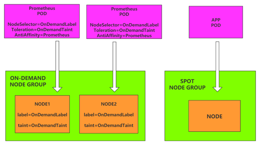 携程酒店直连使用按需实例和竞价实例的混合部署,保证低成本和高可用。一些系统关键组件(比如Cluster Autoscaler),中断就会丢失数据的有状态服务(比如Prometheus)运行在按需实例。而对错误容忍度高,使用灵活无状态的业务应用运行在竞价实例上。通过kubernetes的节点亲和性控制不同类型的服务调度到对应类型标签的实例上。(见图8)