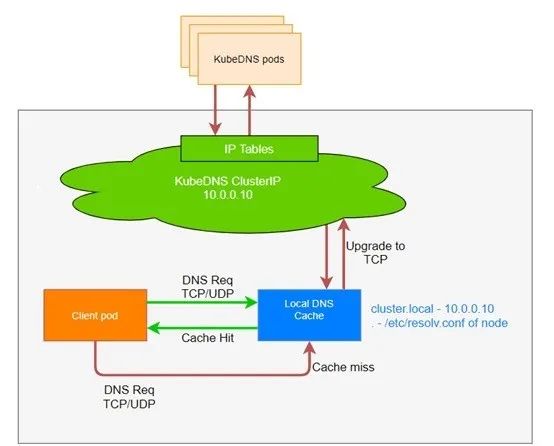 如图9所示,在每个Node部署基于DaemonSet的NodeLocal DNSCache,通过Node LocalDNS缓解CoreDNS服务的DNS查询压力,LocalDNS Cache 会监听所在的 node上每个 Client Pod 的 DNS 解析请求,通过本地的解析行为配置,Local DNS Cache 会尝试先通过缓存解析请求,如果未命中则去 CoreDNS 查询解析结果并缓存为下一次本地解析请求使用。