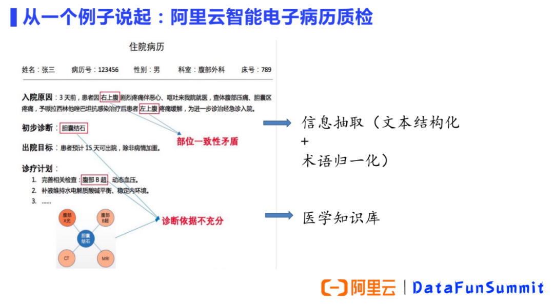 电子病历数据的主要应用场景是电子病历质检。电子病历质检指的是根据各个省市卫建委发布的电子病历书写规范对医生书写的电子病历进行质检,其中浙江省的电子病历书写规范比较领先,大概有240多项检测点。传统的做法是医院设置专门的质检科,由质检科医生将每份病历按照质检点进行人工检查,因此存在效率低、查全率低的痛点。阿里云智能电子病历质检就是帮助医院质检科解决这个痛点的产品。举个例子,在上图这份病历中我们检测到两个不合规的点。