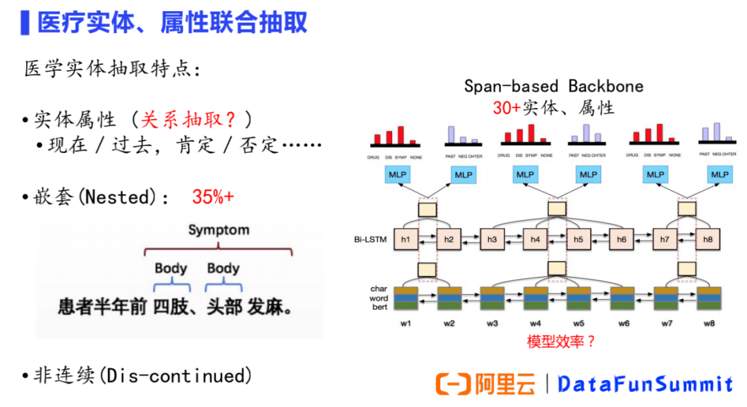 阿里云智能电子病历质检的核心模块儿是医疗实体、属性的联合抽取,医学文本的实体识别有如下3种特点: