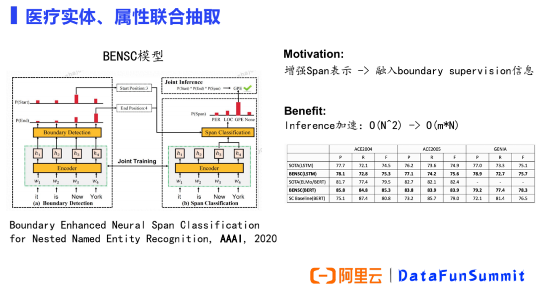 讲者的答案是要对这个模型做改良(2020年讲者将其工作成果发表在AAAI上)。如上图所示,改良span-based模型的motivation是增强span的表示。这里主要借鉴了MRC的思路,即把start及end形成一个span的概率设计进来,我们通过计算“start的概率”ⅹ“end的概率”ⅹ“span表示的概率”进行最终的判断。这个模型的benefit是在推理阶段进行加速,通过为“start的概率”和“end的概率”设定阈值(高于阈值将被预测,而低于阈值会被剥离掉),将模型复杂度由O(n^2)降为O(mⅹN)。m表示句子里的实体个数,N表示句子token的长度,这样在线上应用的话,效率还是非常高的。图中的表格是AAAI20的实验结果,之后我们又不断探索其他模型,在某些数据集上结果已经超过了这个实验结果。