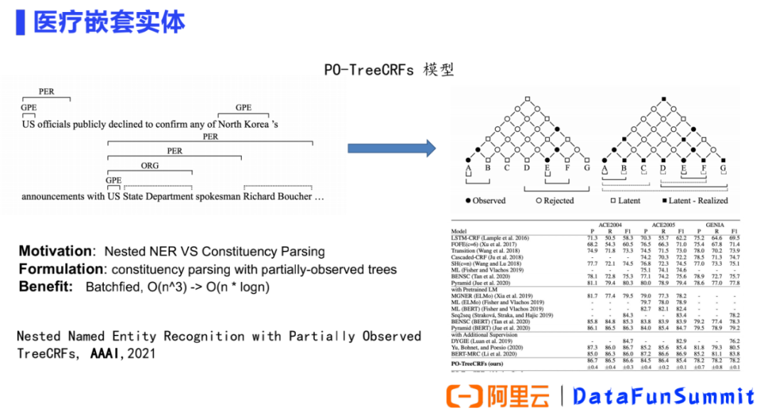 ② 基于嵌套实体构建模型:我们针对医学嵌套实体的特点开展了很多研究的工作,上图是我们发表在AAAI2021的一个工作。我们将嵌套 NER识别问题看作是经典的句法成分分析(constituent parsing)问题, 根据嵌套实体的特点将其视为部分观察(partial observed)到的树,进行选区解析,并使用部分观察到的 TreeCRF 对其进行建模。具体来说,将所有标记的实体span视为选区树中的观察节点(黑点),将其他跨度视为潜在节点(白点)。该模型其中的一个优点是,实现了一种统一的方式来联合建模观察到的和潜在的节点。而另外一个优点是,在进行选区分析时,通过Batchfied将模型复杂度从O(n^3)降为O(nⅹlogn)。