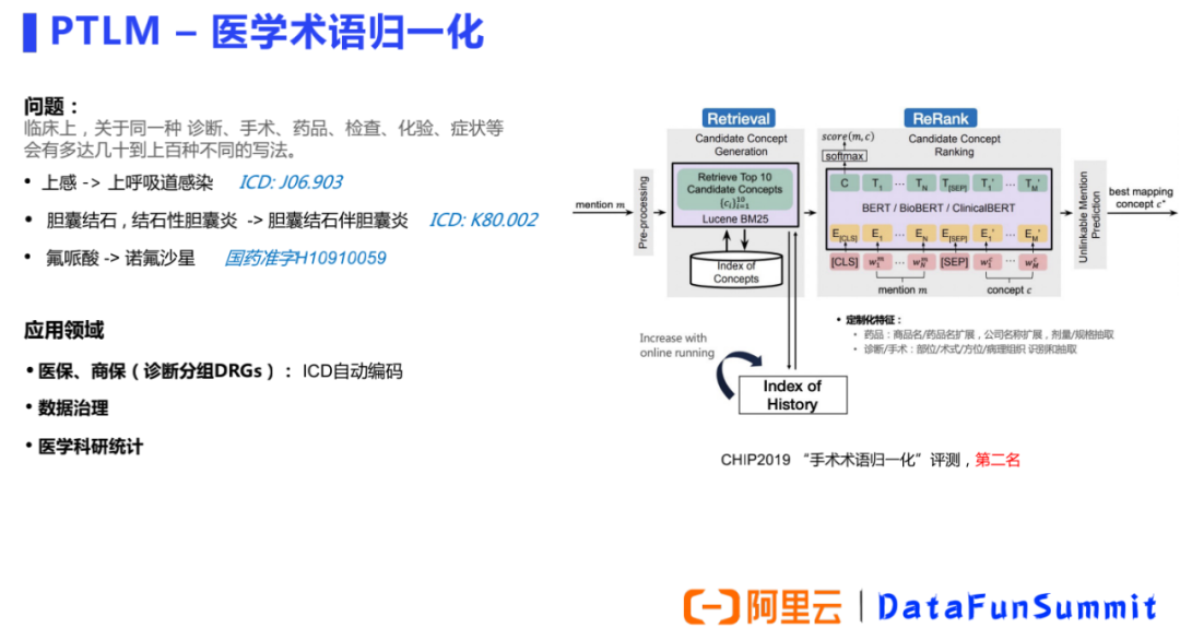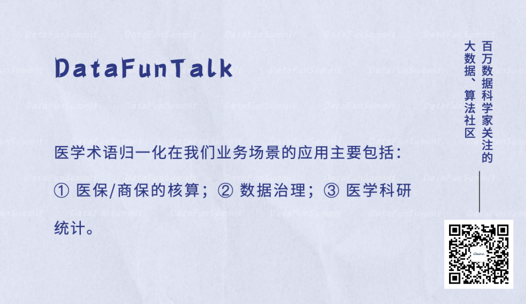 医学术语归一化的技术在我们的业务场景里面用的还是比较多的。第一种是跟大家生活息息相关的医保或商保的核算,其主要根据ICD编码进行DRGs付费及核算。第二种是数据治理,例如不同医院间的数据互联互通。第三种是医学科研统计,如医生要筛选“2型糖尿病”的患者来做队列,“II型糖尿病”也要被识别成同一个术语。
