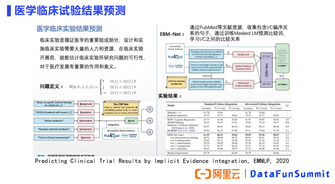 NLP可以基于科学家们的研究经验以及现有的医学知识来辅助地预测临床试验的结果,从而大大提高临床试验实施的效率,由此我们抽象出一个问题,即BPICO。B是Background(研究背景,如研究经验、医学知识),P是Population(或者Patient,代表试验组人群,如新冠患者),I是Intervention(干预手段,如瑞德西韦),C是Comparison(对照组,如安慰剂),O是Outcome(需要观测的试验指标,如血氧饱和度)。总的来说,就是首先给出background,然后给定患者,最后比较治疗方案相对于对照方案的观测指标是上升/下降/不变,上升代表有效,下降或不变代表无效。