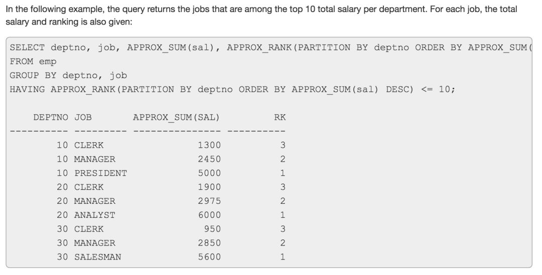 注:18c 中,增加了 APPROX_COUNT 和 APPROX_SUM 来配合 APPROX_RANK 的使用。