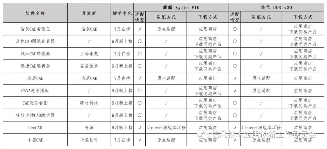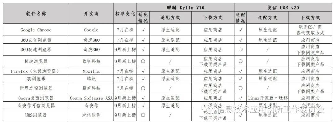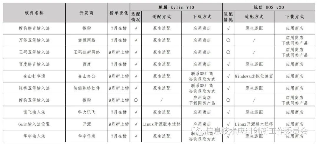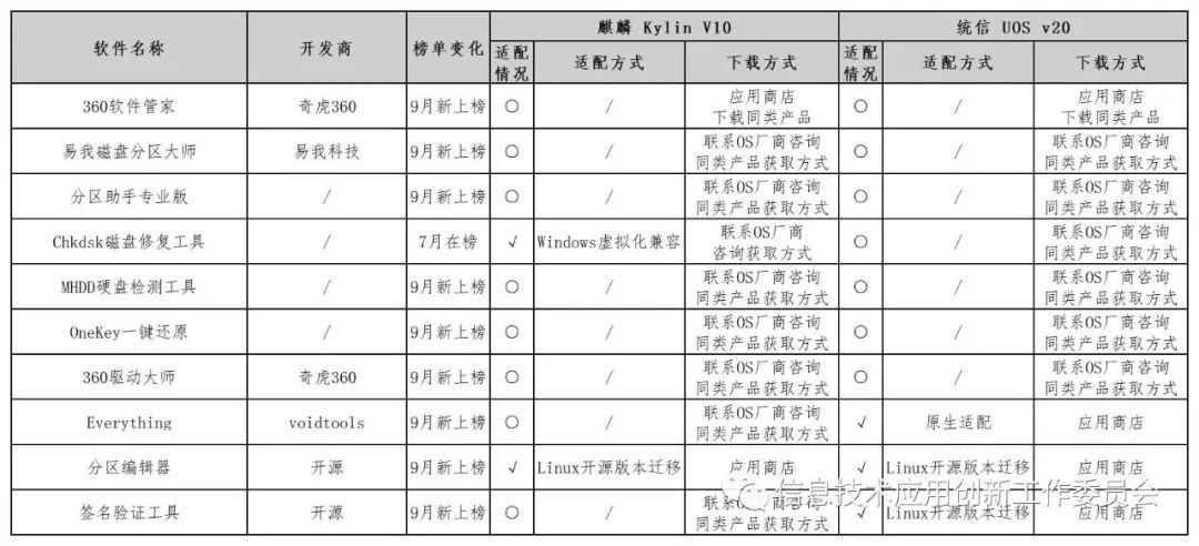 相较于2021年7月发布的常用软件适配清单,麒麟Kylin V10操作系统已适配产品从81款上升至88款,增长比例为8.6%,未适配产品为62款;统信UOS v20专业版操作系统已适配产品从67款上升至90款,增长比例为34.3%,未适配产品为60款。9月版上榜的150款软件中,7月版、9月版连续在榜的有57款软件,麒麟适配46款,适配率为80.7%,未适配但有同类产品的有11款;统信适配48款,适配率为84.2%,未适配但有同类产品的有9款。9月版新上榜的有93款软件,麒麟适配42款,适配率为45.1%,未适配但有同类产品的有51款;统信适配42款,适配率为45.1%,未适配但有同类产品的有51款。后续,信创工委会将联合相关单位定期更新清单,协调产业链上下游加快产品适配,为建设丰富多样应用生态提供更有力支撑。