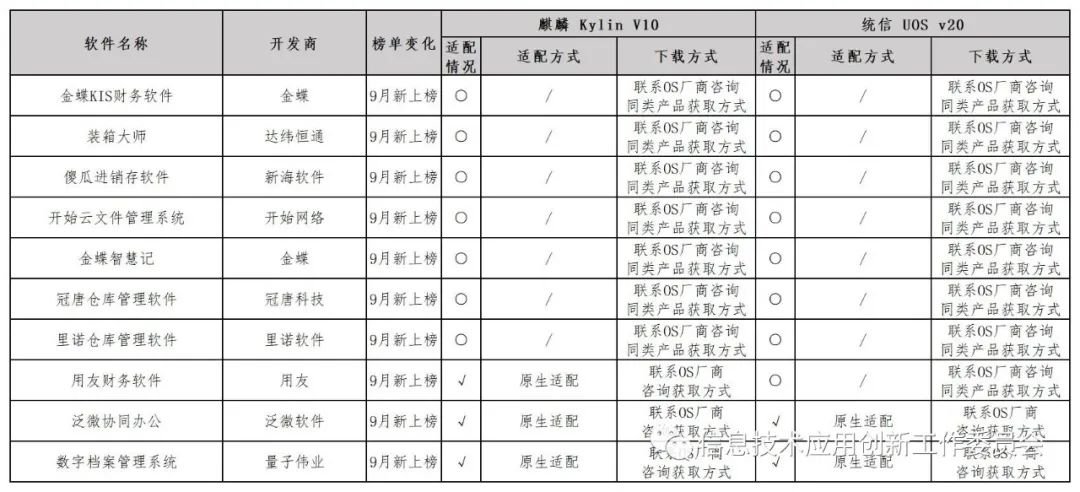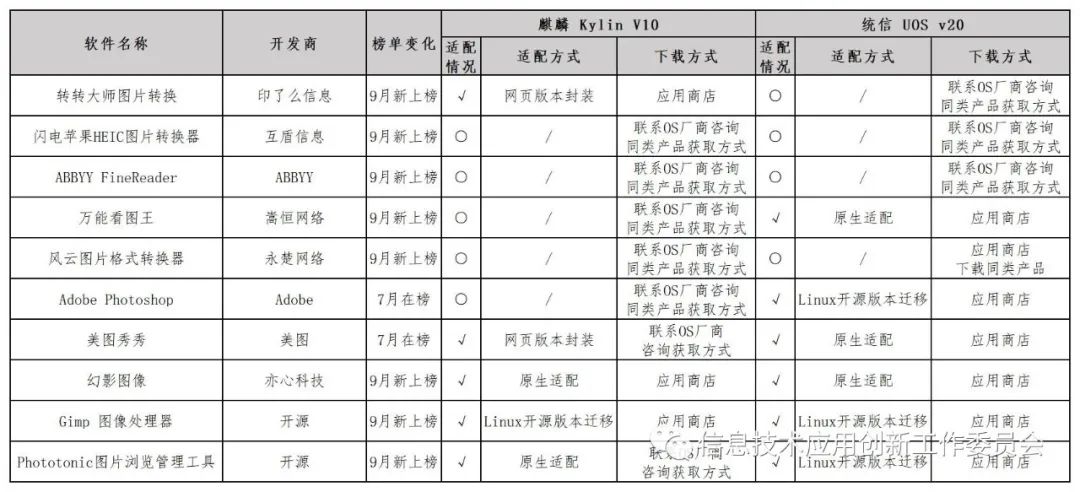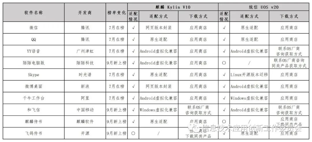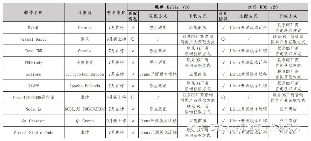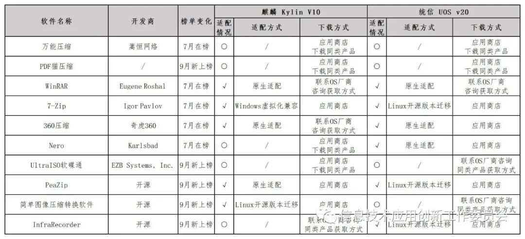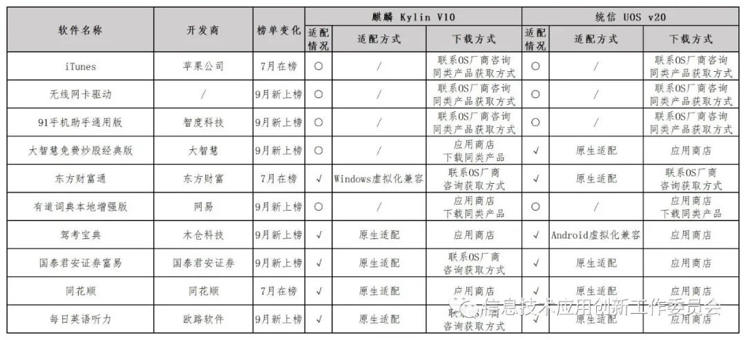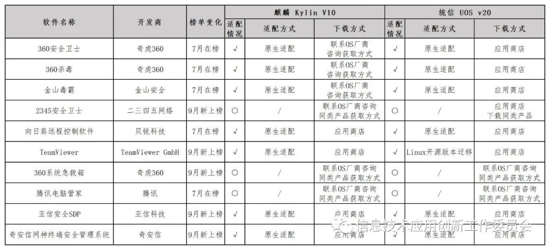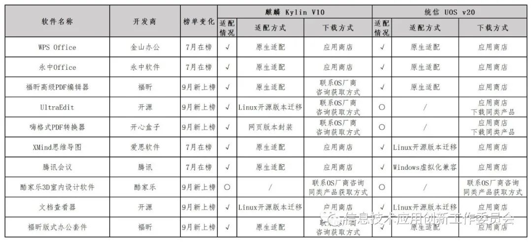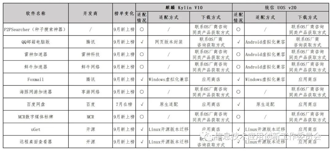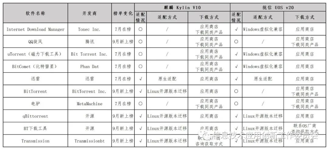 https://eco.kylinos.cn/zoology/commercial.htmlhttps://www.chinauos.com/ecology/adapt3)中关村在线软件下载排行榜、360软件管家、腾讯软件管理中心、麒麟应用商店、统信应用商店2)“○”代表产品未完成适配,但有同类产品可以代替。1)“原生适配”代表产品在操作系统平台已开发或适配原生版本;3)“Windows虚拟化兼容”代表该程序通过Windows容器等技术进行虚拟化迁移;4)“Android虚拟化兼容”代表该程序通过安卓容器等技术进行虚拟化迁移;5)“Linux开源版本迁移”代表该程序在Linux上游有对应版本,进行应用打包等操作后可以提供给最终用户使用;1)“应用商店”代表产品已上架应用商店,可直接下载安装并使用;2)“联系OS厂商咨询获取方式”代表产品尚未上架应用商店,需联系操作系统厂商获取使用方式;3)“应用商店下载同类产品”代表该产品尚未适配,可在应用商店安装并使用同类产品;4)“联系OS厂商咨询同类产品获取方式”代表该产品尚未适配,需联系操作系统厂商获取使用同类产品。