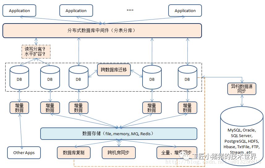 数据库与数据库之间会有数据迁移(同步)的动作,同款数据同步原理比较简单,比如MySQL主备同步,只要在数据库层进行相应的配置既可,但是跨数据库同步就比较复杂了,比如Oracle->MySQL. 数据迁移一般包括三个步骤:全量复制,将原数据库的数据全量迁移到新数据库,在这迁移的过程中也会有新的数据产生;增量同步,对新产生的数据进行同步,并持续一段时间以保证数据同步;原库停写,切换新库。将“跨数据库”这个含义扩大一下——“跨数据源”,比如HDFS, HBase, FTP等都可以相互同步。(yugong, DataX)