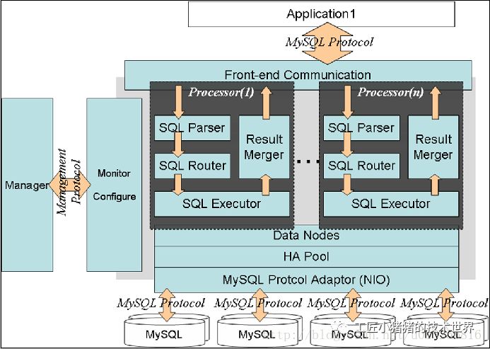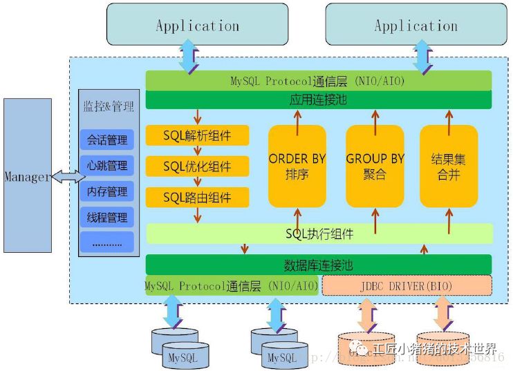 从定义和分类看,它是一个开源的分布式数据库系统,是一个实现了MySQL协议的Server,前端用户可以把它看做是一个数据库代理,用MySQL客户端工具和命令行访问,而其后端可以用MySQL Native Protocol与多个MySQL服务器通信,也可以用JDBC协议与大多数主流数据库服务器通信,其核心功能是分表分库,即将一个大表水平分割为N个小表,存储在后端MySQL服务器里或者其他数据库里。