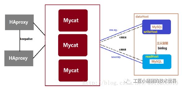MySQL节点开启主从复制的配置方案,并将主节点配置为MyCAT的dataHost里的writeNode,从节点配置为readNode,同时MyCAT内部定期对一个dataHost里的所有writeHost与readHost节点发起心跳检测。