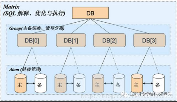 最上层的是分布式数据库分表分库中间件,负责和上层应用打交道,对应用可表现为一个独立的数据库,而屏蔽底层复杂的系统细节。分布式数据库中间件除了基本的分表分库功能,还可以丰富一下,比如讲读写分离或者水平扩容功能集成在一起,或者比如读写分离本身也可以作为一个独立的中间件。(Cobar, MyCAT, TDDL, DRDS, DDB)
