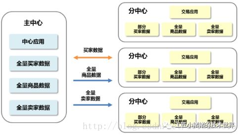 系统包括一个主中心和多个分中心,主中心与分中心之间通过数据总线交换数据。数据流向中,主数据(商品数据、商家数据、用户数据等)的流向从主中心通过数据总线实时同步到分中心,分中心只读;而交易数据(订单数据)的流向从分中心实时同步到主中心;在故障时,会从分中心转移到主中心。