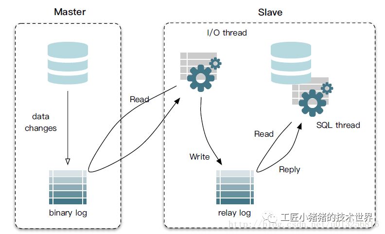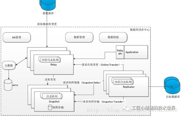 如图所示,数据总线主要分Relay、Snapshot和Replicator三部分构成,其中Relay从来源数据库抽取事务日志,并对Replicator提供日志订阅服务,角色上相当于Mysql Slave IO Thread。Snapshot从Relay订阅所有事务日志,写入持久存储作为快照,同时向Replicator提供批量日志订阅服务,角色上相当于Mysql Slave Relay Log。Replicator:事务日志的消费端,从Relay或Snapshot拉取事务日志将事务日志按配置的一致性应用到目标数据库,角色上相当于Mysql Slave SQL Thread。(参考下面MySQL主备复制原理图)