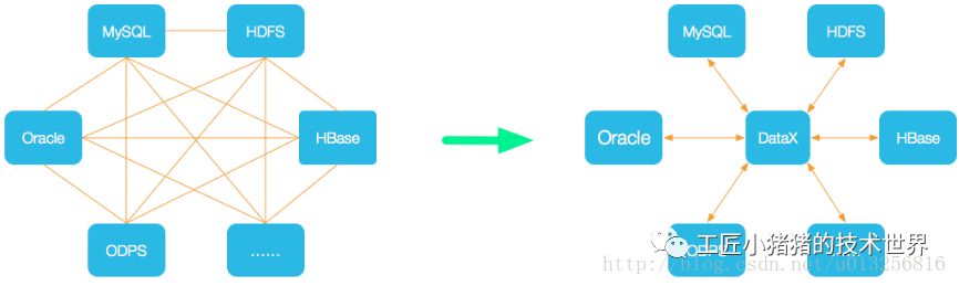 为了解决异构数据源同步问题,DataX将复杂的网状的同步链路变成了星型数据链路,DataX作为中间传输载体负责连接各种数据源。当需要接入一个新的数据源的时候,只需要将此数据源对接到DataX,便能跟已有的数据源做到无缝数据同步。