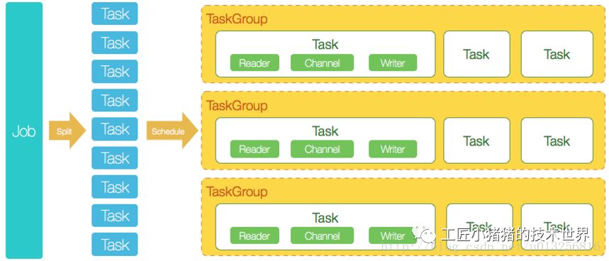 DataX完成单个数据同步的作业,我们称之为Job,DataX接受到一个Job之后,将启动一个进程来完成整个作业同步过程。DataX Job模块是单个作业的中枢管理节点,承担了数据清理、子任务切分(将单一作业计算转化为多个子Task)、TaskGroup管理等功能。