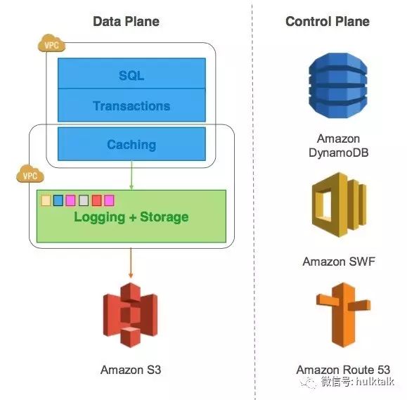 Aurora 使用叫做以服务为中心的架构设计。其实就是 database 节点都是无状态节点,也就是只包含了(SQL + Transactions) 这两层,所有的数据都存在storage service。这里的storage service 使用的是Amazon S3 服务。