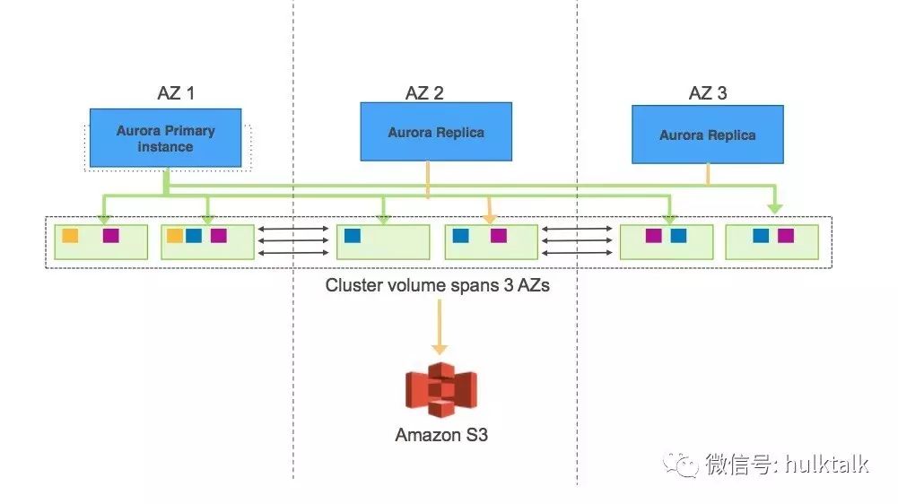 可以看出Aurora AZ是有主从结构的存在, 数据被切分成多个PG(Protection Groups), 每一个PG 由6个segment 组成, segment大小是10G. 每个PG的6个segment分散在3个AZ 中, 每一个AZ的storage node 由多个 segment 组成, 所有的这些PG 的redo log最后都会存储在Amazon S3上.