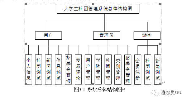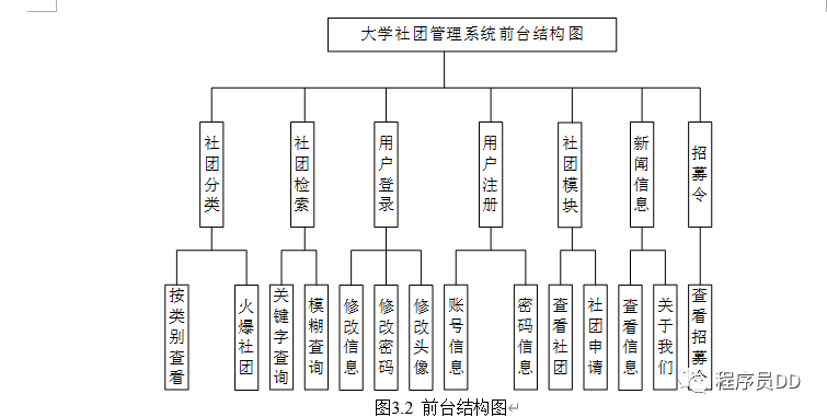 大学生社团管理系统得用户角色有两类,分别是:管理员,普通用户。普通用户对应前台界面,管理员主对应后台管理,管理员主要有我的社团模块,类型管理模块,招募令模块,用户申请模块,新闻列表模块,发布新闻模块;普通用户可以注册成为本系统的会员,在社团系统中进行预览新闻之后可加入的社团,在已经动态的社团资讯信息,查看社团的最新资讯以及社团的要求,在合理的时间内,发出加入社团的请求,请求社长进行审批。