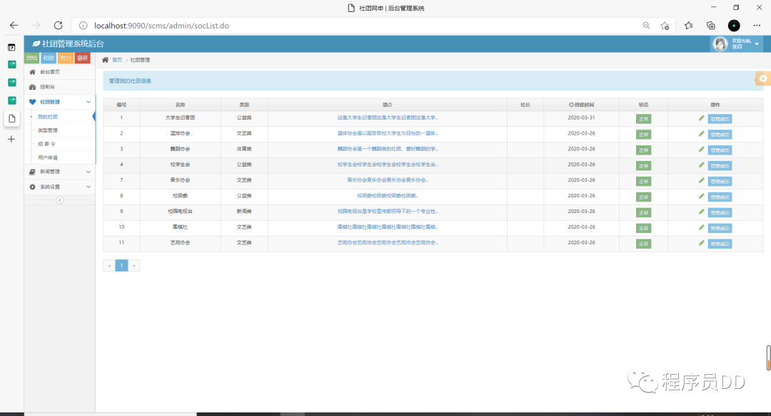 在进行的相关的社团管理界面内,就可以针对社团管理进行相关的管理操作,可以进行相关的设置