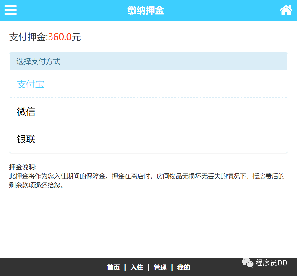 该项目可以说是结合支付宝支付结合相关的沙箱环境进行的设置,并且相关的配置信息已经全部设置好了,如果需要进行相关的配置,可以参考合格支付宝的设置进行相关的在线支付业务逻辑的开发,配置的时候可以结合沙箱环境进行配置,整体的在线支付的逻辑还是非常容易实现的,这个demo的案例非常的好,强烈推荐学习"062-全自动酒店系统"
