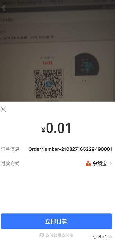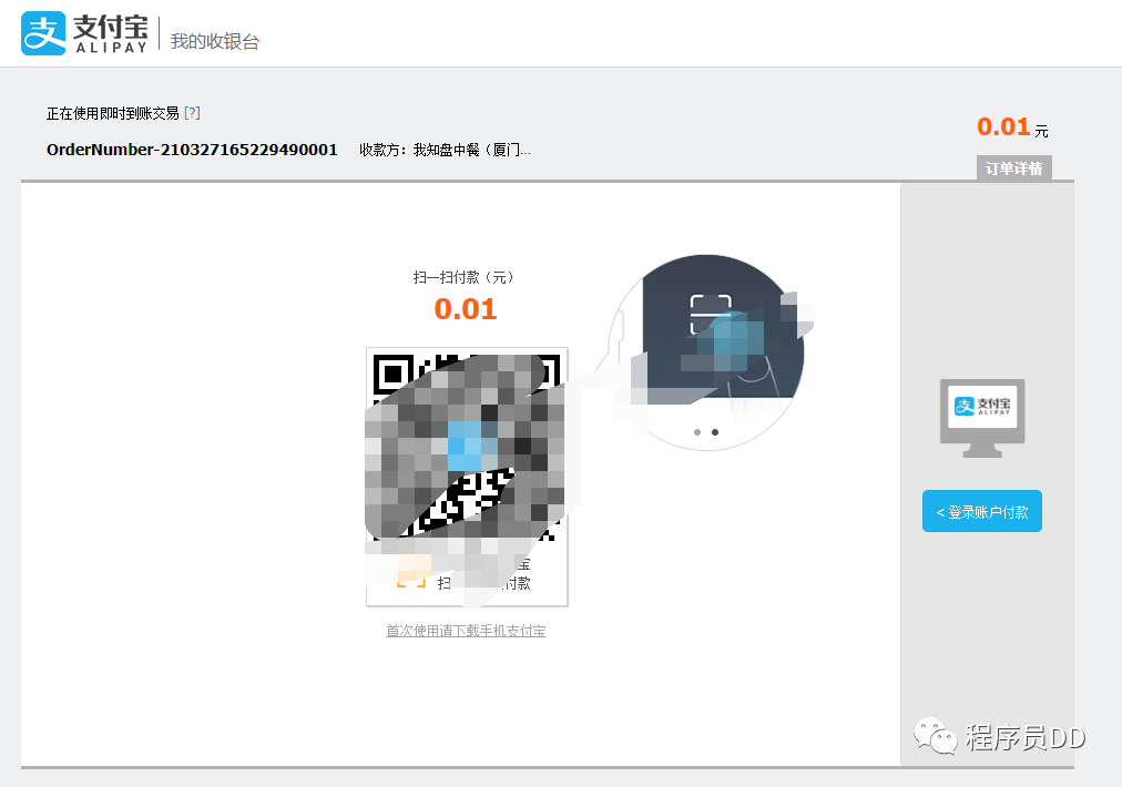 接下来就是走订单支付的操作,会跳转到对应的支付页面进行相关的支付操作,这里默认的是真实的支付,支付的金额为0.01可以进行真实的支付宝交易操作