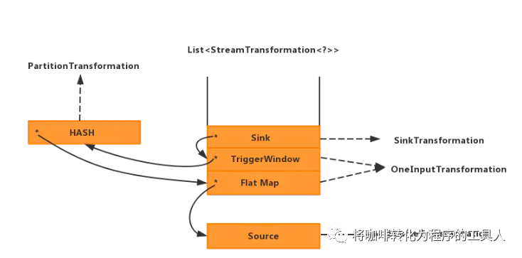 在StreamExecutionEnvironment中有个成员变量transformations,在这里记录了我们所有的算子信息(这里看似是个列表,实际上每个元素都带有父子信息,整体可以理解为一个树)。
